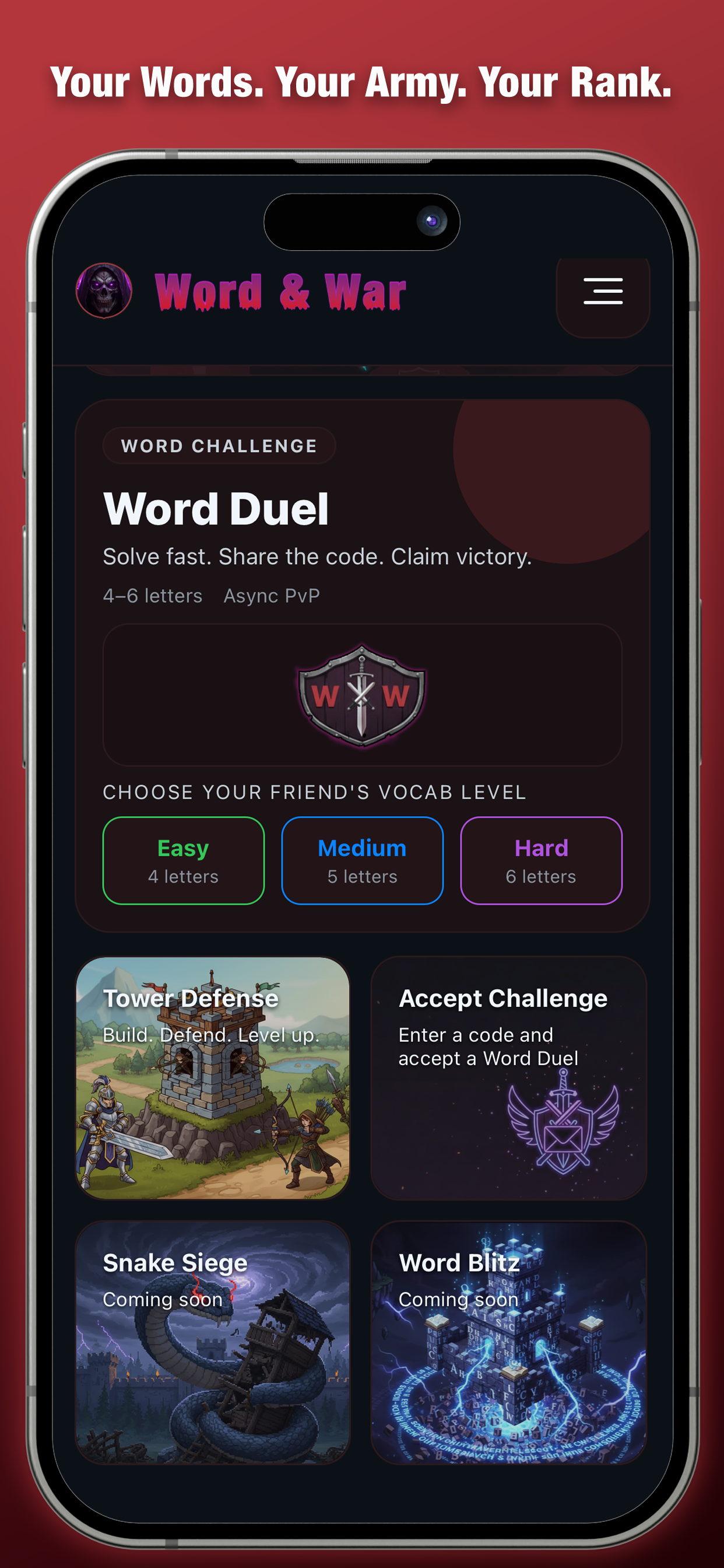 One global leaderboard that combines Word Duel and Tower Defense. The more you play, the higher you climb.