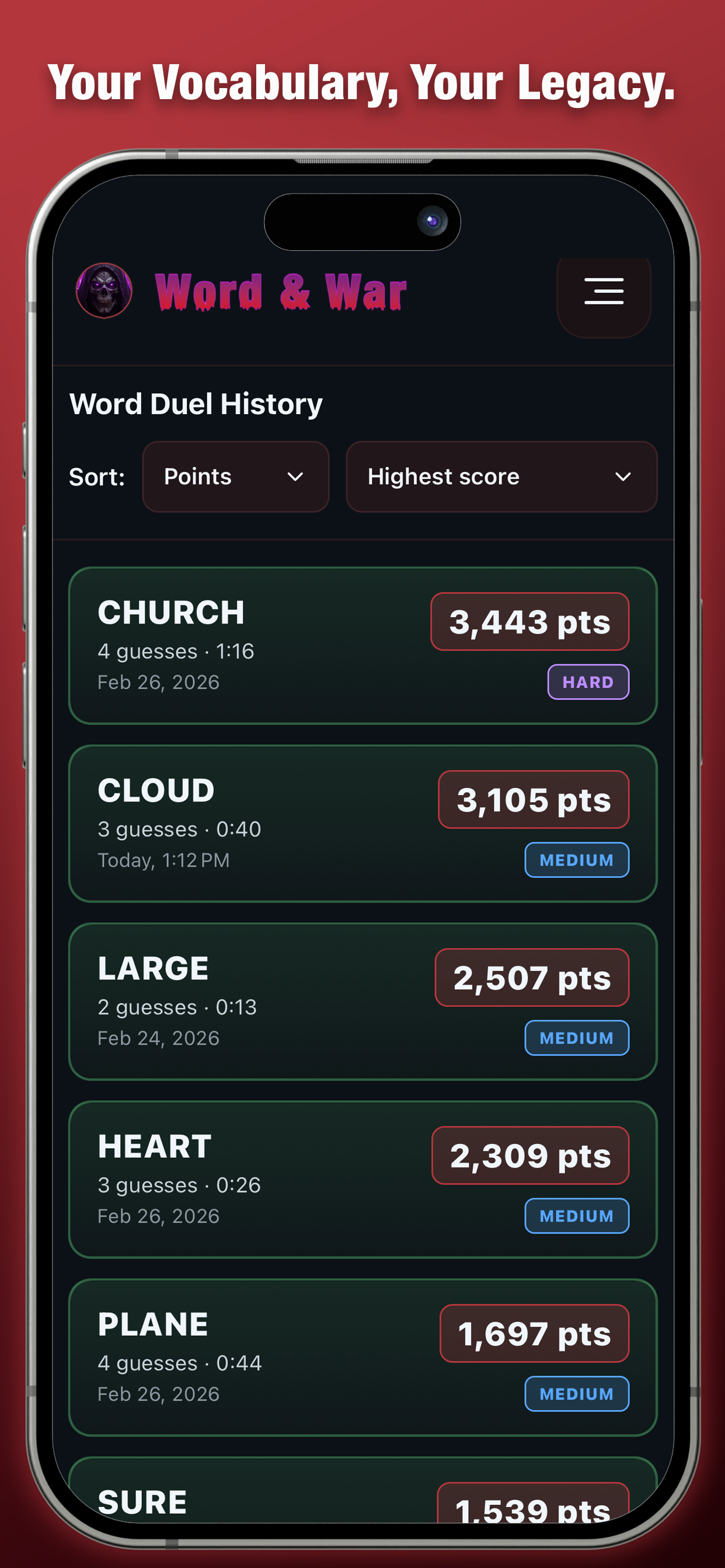 Guess the word in fewer tries, generate a challenge code, and see who can beat your score the fastest.
